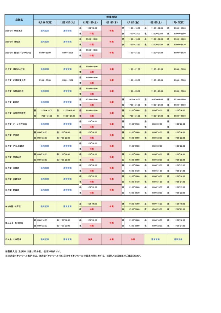 また「日月堂」「まめぞう」「みちる屋」「日々是」「ばんぶる」各店の営業時間の一覧は下記の通りです。