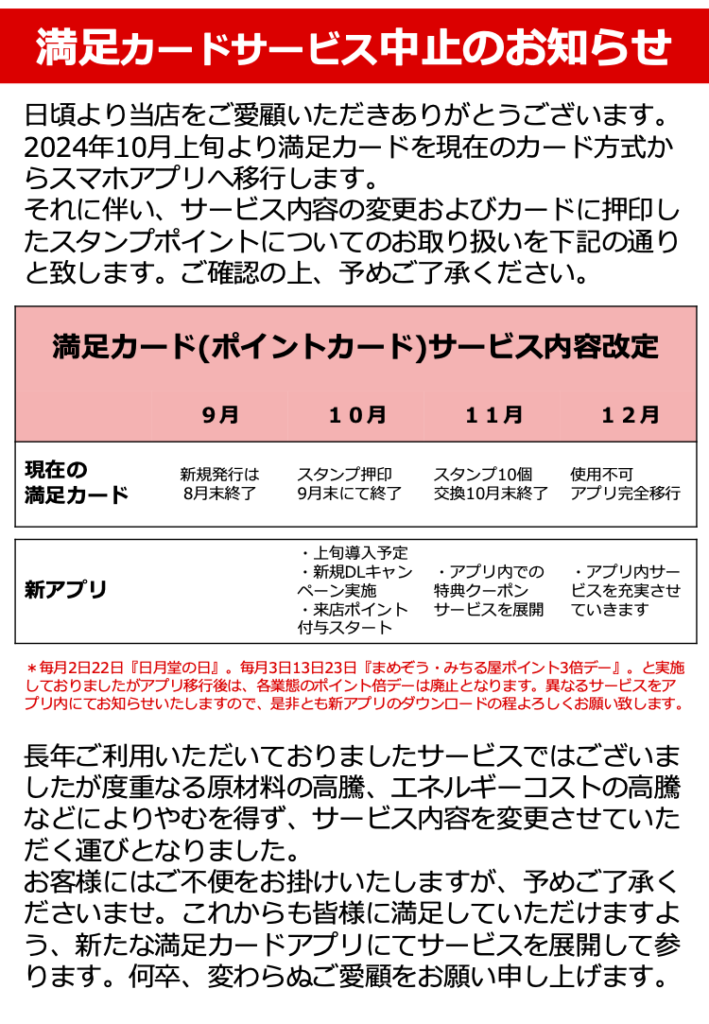 2024年10月上旬より、現在の「満足カード」をスマートフォンアプリへ移行いたします。