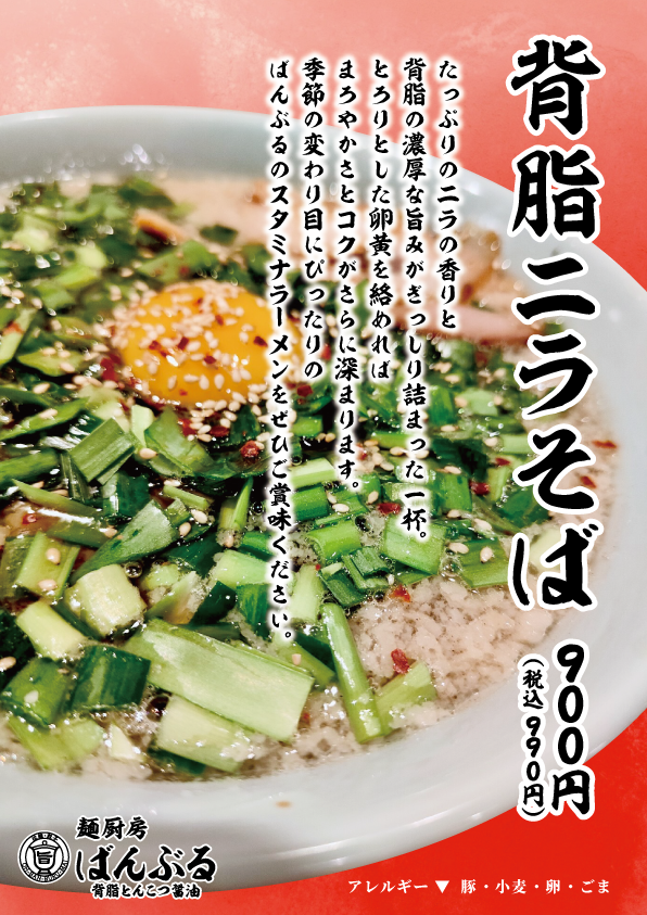 この度、期間限定で「背脂ニラそば」が登場しました!